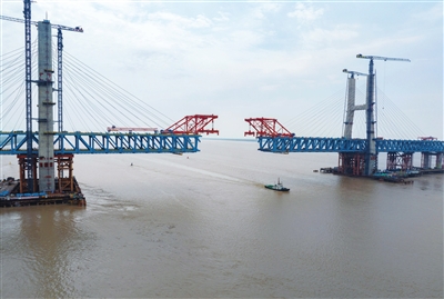 崇启公铁长江大桥是沪渝蓉高铁沪宁段关键控制性工程,全长4.09公里,横跨长江入海口北支航道,采用双层公铁两用无砟轨道斜拉桥的设计,上层为设计时速100公里的双向六车道一级公路,下层为设计时速350公里的双线高速铁路及设计时速250公里的双线城际铁路,主通航孔跨径达400米。目前大桥主跨钢梁4个节段等待吊装,预计5月下旬完成大桥合龙。