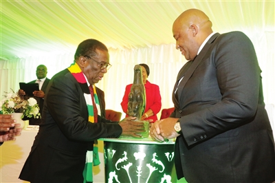 4月15日,在津巴布韦哈拉雷总统府,津巴布韦总统姆南加古瓦(左)在交接仪式上查看回归的“津巴布韦鸟”石雕。新华社 发