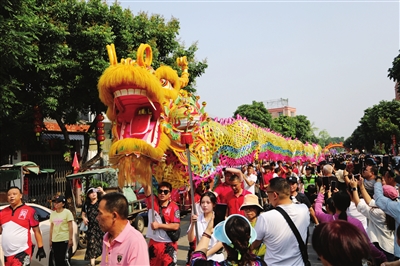 4月19日,沙溪镇龙头环村人声鼎沸,“沙溪三月三”民俗巡游活动火热举行。巡游队伍穿梭在龙头环村青砖黛瓦、古祠侨房之间,成为沙溪人凝聚乡情、传承文脉的纽带。“沙溪三月三”于2015年入选广东省非物质文化遗产保护名录。今年的巡游队伍中,巨型金龙是重头戏。金龙长达202.6米,仅龙头就重达25公斤,需要80名舞龙手默契配合才能灵活挥舞,另外有160人全程协同保障。金龙所到之处,气氛瞬间推向高潮。村民、游客争相上前,摸龙须、钻龙身、触龙尾,寓意沾龙气、讨吉祥。