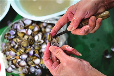 随着“咚”的一声铜锣敲响,熟悉的动作自记忆深处苏醒,一双双灵巧的手迅速翻飞起来。一手抄起泥蚬,一手持蚬刀塞进贝壳缝隙,开、撬、剥、放,一气呵成。