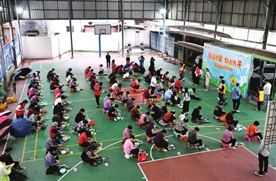 雨渐停歇,人们陆续提着自己带来的板凳、水盆、蚬刀走进球场,对着地面的编号就座等候。不多时,91个编号满座。