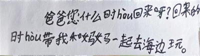 虽然聚少离多,但是女儿对爸爸的爱浓得化不开。每到马伟南结束假期要去上班的时候,一家人总是陪着他去车站。自幼儿园中班开始,女儿学会了画画和写一些字,每次告别时就给马伟南的口袋里塞“礼物”,有时候是一张小纸条,有时候是一幅画,她还要求爸爸,现在不能够打开,要等上车了才可以看。当马伟南在南下的火车上打开这些温热的纸条时,一股暖意涌上心头,女儿用稚嫩的小手把对爸爸的爱都写在了纸上,色彩鲜艳的画面里,常常是一家三口快乐地在一起。