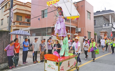 穿过绿浪翻滚的稻田,走上新修整的现代柏油马路,起源于清朝的秋千色,至今仍在巡游活动中大夺眼球:色芯、色脚随着秋千上下飘动,尽展凌空飘逸之美。