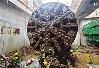 下午3时,富康路与康华路交叉路口建设工地,地下20米的施工现场机器声轰鸣,施工人员正在进行石岐站接收井下渣土清理以及盾构机内部拆解施工。
