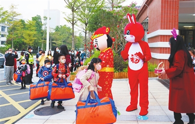 舞狮队迎接入校,“小兔子”仪仗队等候,走红地毯、击鼓明志、领心愿卡!2月6日,中山市香山小学等学校在充满仪式感的氛围中,迎来了兔年新学期开学。