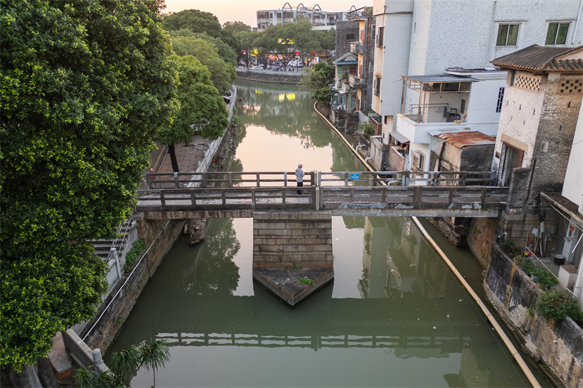 跃龙桥独特的石木混合结构,也源于这里曾是镇中龙舟竞渡的地点。“端午时龙舟要从木梁下穿行,”李尚仁比划着桥面的高度,指着碉楼下一段水泥桥面说,“以前这里应当是可以提起来的木梁桥,能临时抬高让龙舟通过,只是后来才改成水泥桥面。”