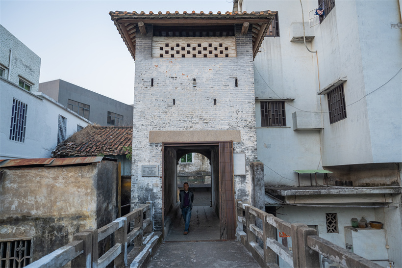 跃龙桥北矗立着民国时期的碉楼“镇东楼”,其融合了西式廊柱、拱券以及山花装饰等元素,构建出兼具防御功能的桥亭结构,它是中山市唯一一座具备防御功能的桥梁。(摄影丨缪晓剑)