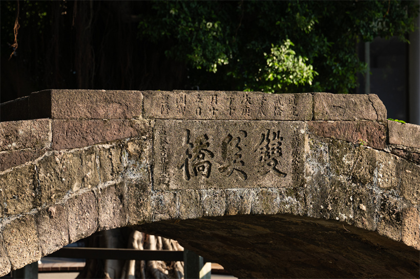 600多年过去,红色砂岩的桥身被岁月浸得格外温润古拙。拱顶桥侧镶嵌的“双美桥”石刻上,记录着关于这座桥的“时光密码”。石额上款“嘉靖岁次辛酉”,即明嘉靖年间(1561年),是时人对石桥的第一次重建。下款则书“孟秋吉旦重修”,则是指清朝康熙55年(1716年),小榄出身的进士何圣强对双美桥的二次重修。桥侧石额上方还刻有“道光贰拾年岁次庚子十月十一日阖乡重修”,则是指清道光20年(1840年),双美桥迎来第三次重修。跨越百年的维护与重修,是小榄乡贤护桥爱乡的热忱。