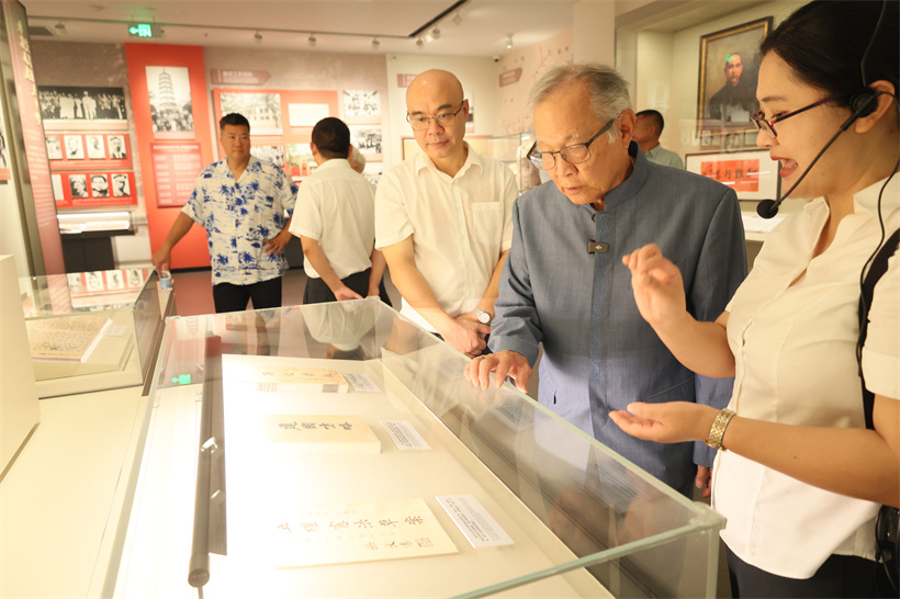 孙国雄听讲解员介绍孙中山故居纪念馆的藏品。(摄影丨易承乐)