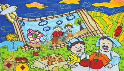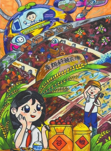 同学们的画笔藏着对秋日丰收的多样想象:有的铺展秋日田野的景象——金黄稻浪翻涌,饱满的玉米,红透的果实,每一笔都藏着丰收的喜悦;有的则大胆畅想,让传统丰收场景与先进科技巧妙相遇,用充满想象力的画面,展现出高效、智能的未来农业图景。