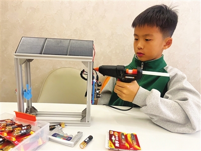 接下来,我们分工合作,哥哥设计型材尺寸,爸爸帮忙切割加工,我负责搭建框架,之后用胶枪把太阳能板固定在框架顶部,小风扇装在左侧,再用铜芯线将太阳能电源管理模块、风扇和太阳能板一一连接。发明原理很简单:太阳能板吸收阳光转化为电能,经电源管理模块稳定输出,带动风扇加速空气流动,让湿衣服快点驱走潮气!