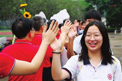 6月7日上午,东区中学教职人员身穿红衣为高三学生送考,祝愿考生“红”运当头、“红”途大展。本报记者 夏升权 摄