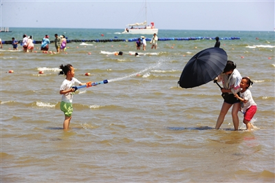 6月8日,游客在河北省秦皇岛市浅水湾浴场戏水玩耍。