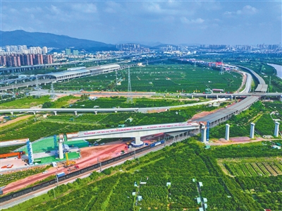 此次转体施工地处深江铁路控制性工程——广中江特大桥跨虎跳门桥段,该桥段长13.41公里,其337号至339号墩上跨广珠货运铁路T构转体桥重达11216吨、跨度160米。项目采用转体法施工,首先平行于既有铁路浇筑梁体,再通过转体系统,将梁体顺时针旋转30.2度完成转体对接。