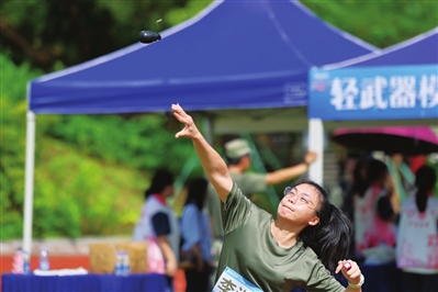 雨势渐小时,手榴弹投掷、轻武器模拟射击两项赛事同步开赛。田径场的中间区域是手榴弹投掷的竞技场,一枚枚手榴弹模型在选手们的奋力挥臂间呼啸而出,在空中划出一道道有力的弧线,最终在远处的草地上激起阵阵雨水。“55.19米!”“48.7米!”“46.8米!”每一个出众的数字传来,观摩区都会爆发出由衷的赞叹与喝彩。
