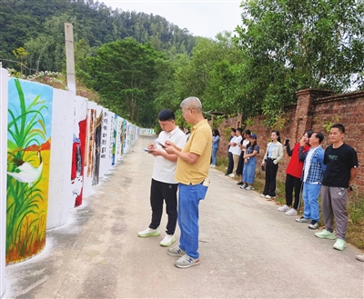 上午10时许,美术老师已陆续来到了青龙山脚下,欣赏作品和交流创作心得。粉刷一新的白色水泥柱子上,书法遒劲有力,绘画不拘一格,稻田、醒狮、山林、白鹤、牌坊……这些熟悉的风景都是老师们前几天一笔一划精心创作出来的。获奖者叶妃常老师说,“百千万工程”给古鹤村带来了实实在在的变化,他用了大片的红色把感受一点点描绘出来,通过颜色对比带来更强的视觉冲击。三乡镇宣传和教体文旅办公室主任邓菲表示,三乡镇中小学美术教师团队以墙绘为纽带,让美育走出校园、服务乡村,画笔不仅为古村“提颜增韵”,也“画”出了教育资源反哺乡村振兴的探索,希望通过美育连接学校与乡村,用艺术赋美乡村发展,进一步助力“百千万工程”建设。