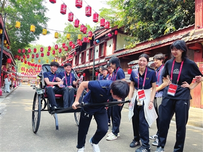 在中山影视城,年轻的运动员们被门口的醒狮表演吸引,纷纷上前与演员合影留念。在长安镇主题街区,身着唐装的演员热情邀请运动员一同游玩。运动员们沉浸式体验“穿越时光”,纷纷参与拉弓射箭、坐黄包车等互动游戏,“长安小镇”瞬间沸腾起来。进入民国风主题街区,运动员们举起手中的手机,与背后的骑楼街合影,不同角度都让他们大呼“美美美”。