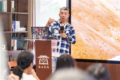 讲座开始,汤琦首先展示了自己的多幅航拍作品。民众街道的水杉、深中大桥上的日出、成群啄食的白鹭,川西雪山上的日照金山,甘南高山下的牦牛,静谧美丽的景色与苍茫的天地形成一种辽阔高远的拍摄视角,给人极强的视觉震撼。