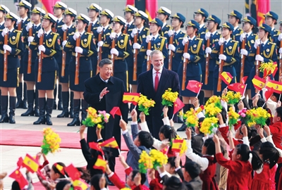 习近平欢迎费利佩六世国王访华,指出中国和西班牙都有深厚的历史文化底蕴。建交50多年来,两国坚持从战略高度和长远角度看待和发展双边关系,相互尊重、相互支持、相互成就,树立了不同历史文化、不同社会制度国家友好相处、共谋发展的典范,也为推动全球开放合作、维护国际公平正义发挥了重要作用。西班牙王室为中西关系发展作出了突出贡献。在两国迎来建立全面战略伙伴关系20周年之际,费利佩六世国王对中国进行国事访问,对推动两国友好合作不断向前发展具有重要意义。
