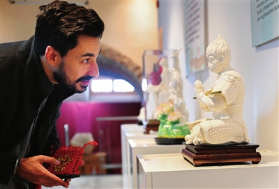 11月11日,一名男士在西班牙塔拉韦拉文化中心欣赏德化白瓷展品。当日,“中国白·德化瓷”西班牙巡展在西班牙塔拉韦拉文化中心举行。 新华社 发