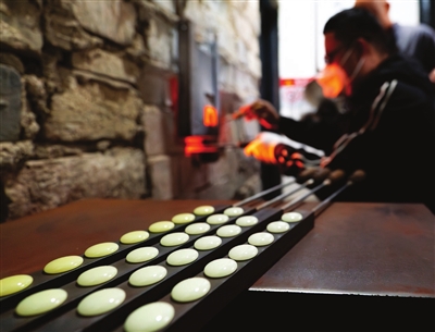 走进位于保山市隆阳区金鸡乡的永子文化园,上千度的窑炉昼夜不息。永子第十二代传人、国家级非遗传承人李国伟坐于炉前,目光如炬。他右手持特制滴棒,从容蘸裹熔化的玉料,将其轻巧滴沥在左手所持的厚铁板上。在一点一收间,一枚枚莹润细腻的永子从火红的液态逐渐凝固成扁圆的固态,在铁板上整齐排列。“这看似机械、快速的动作,至少需要六七年的苦练才能达到心手合一,”李国伟说,“因为滴制永子没有模具,大小薄厚全凭经验和手感。”40多度的室温环境下,火光照映在李国伟脸上,汗水浸湿衣衫,他却气定神闲,一气呵成,几分钟就滴制出一盘大小、薄厚统一的棋子。
