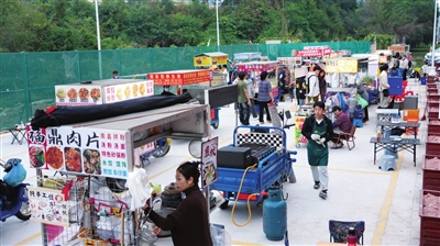 另一位摊主魏师傅摆设的烤鸡摊位在疏导点内生意兴隆。“现在这样规范摆出来,有规模,看着也干净,学生和周边居民都愿意来买。”魏师傅指着规划清晰的黄色摊位方格说,“而且再不用担心被投诉,能安安稳稳地把这点小生意做下去。”魏师傅说,五桂山相关部门执法很有人情味,每次都是劝离、教育和引导他们规范摆摊,“看到摊位越来越多,政府就想方设法为我们设置合法的疏导点,引导我们过来,他们是真心想帮我们解决问题。”