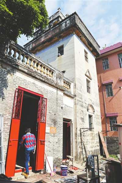 青砖斑驳的墙面旁,新漆的朱红铁门半掩着;杂草蔓生的院落中,工人正忙着清理杂物;百年碉楼的顶层,镀锌钢架已稳稳托住老化的楼板……历经数十年沉寂,坐落于火炬高新区窈窕下街的这栋闲置老侨房,正在冬日暖阳中缓缓“苏醒”。