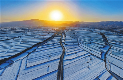 12月13日在山西省临汾市襄汾县陶寺乡中梁村附近拍摄的梯田雪景(无人机照片)。
