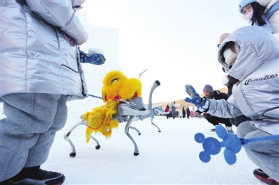 12月17日,游客在哈尔滨冰雪大世界园区内与机器狗互动。