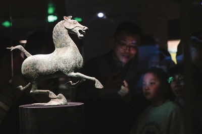 东汉铜奔马又名“马踏飞燕”,是甘肃省博物馆的镇馆之宝。1月26日晚,为迎接农历丙午马年的到来,甘博举行了“马力全开——博物馆启航夜”活动。活动创新采用“主题晚会+夜探博物馆”的模式,现场发布了三款全新设计的马踏飞燕贺岁毛绒玩偶,还上演了别开生面的文创走秀与文艺演出,让观众在沉浸式夜游中体验了一场古韵与新潮交融的文博盛宴。