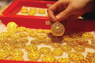 1月28日,员工在位于浙江省杭州市萧山区瓜沥镇的杭州航民百泰首饰有限公司展厅整理黄金首饰。