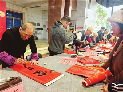 今年92岁的彭长是土生土长的圣狮村人。他学习书法已有70多年,多年来一直乐于为大家写字,当地不少牌坊、庙宇、公园、学校的题字都由他书写。当天上午9时,他带着10多位学生来到活动现场。一见到这位熟悉的老先生,乡亲们纷纷在他桌前排队等候。“我每年都为大家写春联,从十几岁到现在,从没间断。”彭长站了近两个小时,手中毛笔一直没停过。休息时,他告诉记者,举办这样的活动,既能营造喜庆的节日氛围,又能提升乡村文化影响力。
