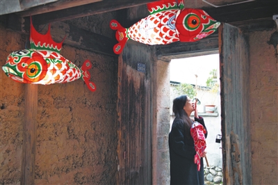 2月7日,在安徽省黄山市黟县碧山村,游客在当地民居门前手持鱼灯留影。