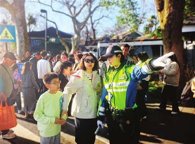“绿灯行人请快速通行”“附近停车位紧张,可以考虑通过公共交通换乘到达”……在断桥与北山路交叉口,杭州市公安局交管支队景区大队灵隐中队民警李雨杭与同事指挥着行人和车辆,忙碌而从容。