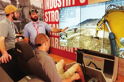 不远处的三一重工展厅,来自加拿大的建筑工人马克·克雷西坐进智能挖掘机器人系统的操作舱,轻推操纵杆,远在浙江湖州矿山试验场的挖掘机铲斗同步起落、回转、挖掘——施工指令通过5G网络和人工智能(AI)算法实时传输。