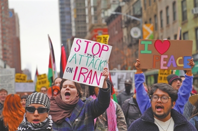 当天,数百名民众聚集在纽约市曼哈顿联合广场,高举伊朗国旗,手持“停止对伊朗战争”“不要插手伊朗”等标语,高呼“当今世界最大的威胁是特朗普和美国”。