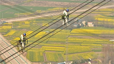 近日,我国“西电东送”重要通道——±800千伏特高压金塘线启动全面检修。在安徽省铜陵市枞阳县长江边,检修工人穿戴专业防护设备,在最高达345米的特高压输电线路上攀爬走线、精心作业,保障输电线路安全。