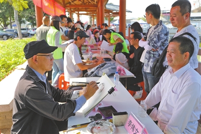 午后的左步村观雨廊人头攒动,一张张画板一字排开,14位艺术家现场挥毫创作,其中10位省美协漫画家各展所长,勾勒出一幅幅生动鲜活的肖像漫画。活动还未正式开始,现场就排起了长队,不少村民和游客提前一个多小时前来等候。截至当天下午4时,现场完成的漫画作品已超50幅。