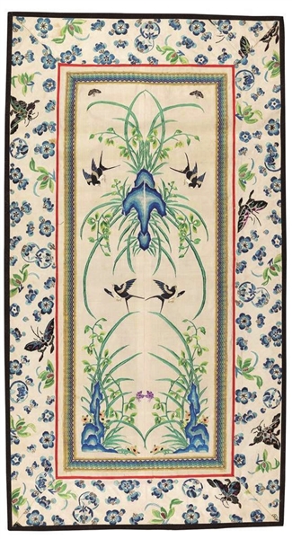这件绣品的左右单件挽袖,均为对角式构图,下方和中心偏上方有两块湖石,周围是盛放的兰花,叶片修长,花茎劲挺,花姿婉约,参差错落,疏密有致。春燕与蝴蝶似被幽幽的兰香所吸引,穿梭于花丛之中,大有“兰芳人未采,花发蝶先知”之意。