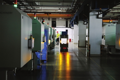 在该公司的黑灯车间里,光线微暗,5G技术全覆盖支撑起高效协同生产,AGV无人搬运车替代人工物流,工位满料后即刻接收指令,自动完成跨车间物料流转并同步数据,生产效率显著提升;几位技术人员在查看机器面板上的数据,正在交流分析着;工厂里的自动导引AGV,根据激光雷达扫描行走,有条不紊地进行工作,多轴机器人在自动生产线上下忙碌着。