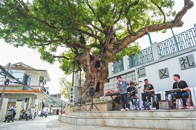 在大树下办音乐会,是他构思多年的心愿。最近,终于实现。陶文俊联系了深圳知名音乐策划人、本色音乐总监郭翔,以及认识多年的乐队朋友,决定为村民们办一场露天的公益演出。“小鳌溪村可谓音乐之乡,它是小提琴名家林宜弩的家乡,林宜弩的儿子林友声是国家一级指挥、上海歌剧院的指挥,此前也来过这里寻根。”为了这场音乐会,陶文俊三天三夜没合眼。他还制作了一批周边文创,并将销售所得一半捐给香山古樟作保养费。当天也是他爱人小敏的农历生日。“她为我们这个家付出了许多。”他向妻子投去温暖的微笑。