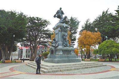 4月19日,在智利南部蓬塔阿雷纳斯,一名男子经过武器广场上的麦哲伦纪念碑。蓬塔阿雷纳斯是智利南部麦哲伦-智利南极大区首府,是麦哲伦海峡的主要港口城市,也是进入南极的重要门户。新华社 发