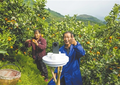 图为4月23日,周功寿(右)在脐橙园里直播,老伴王学凤在采摘脐橙。新华社 发