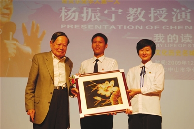 2009年12月14日,侨中迎来55周年校庆。当时87岁高龄的杨振宁教授受全国政协常委、香港新华集团主席、侨中校董会董事长蔡冠深博士的邀请,来到侨中讲学。他以“我的读书教育生涯”为主题,用朴实无华的语言将自己的求学经历娓娓道来。他还在现场展示了与“两弹元勋”邓稼先的珍贵合影,深情回忆两人跨越半世纪的友谊。