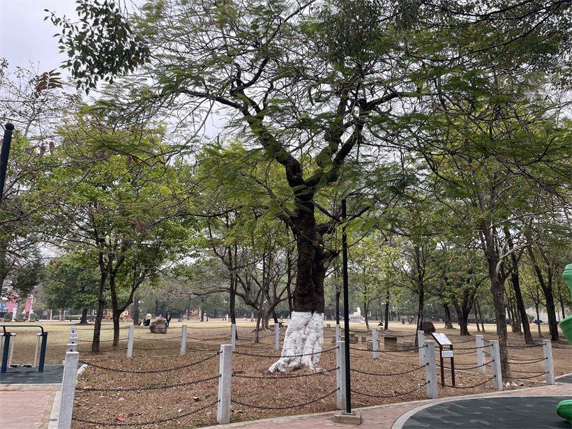 常常逛中山沙溪公园的街坊们最近发现,公园改造提升后,三棵苍劲古树被古典石栏杆温柔围合,树旁立起“沙溪古树公园”的铜牌,还多了三组图文并茂的科普宣传栏。细读之下,人们才惊觉——原来身边这三棵枝繁叶茂的大树,一株榕树已逾190岁,另一株榕树110岁,凤凰木亦有130岁高龄。它们不是普通的景观树,而是穿越百年风雨、默默见证沙溪变迁的“活化石”。